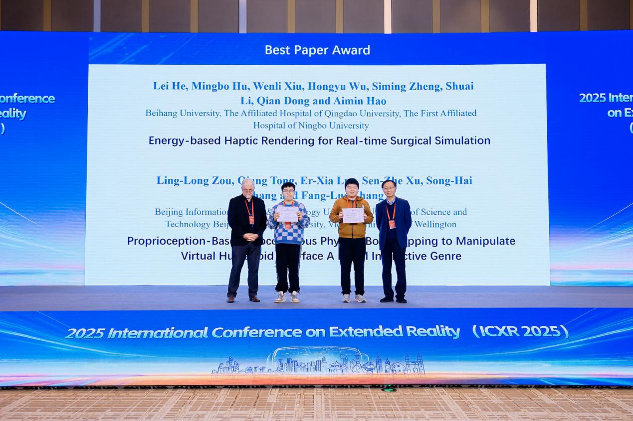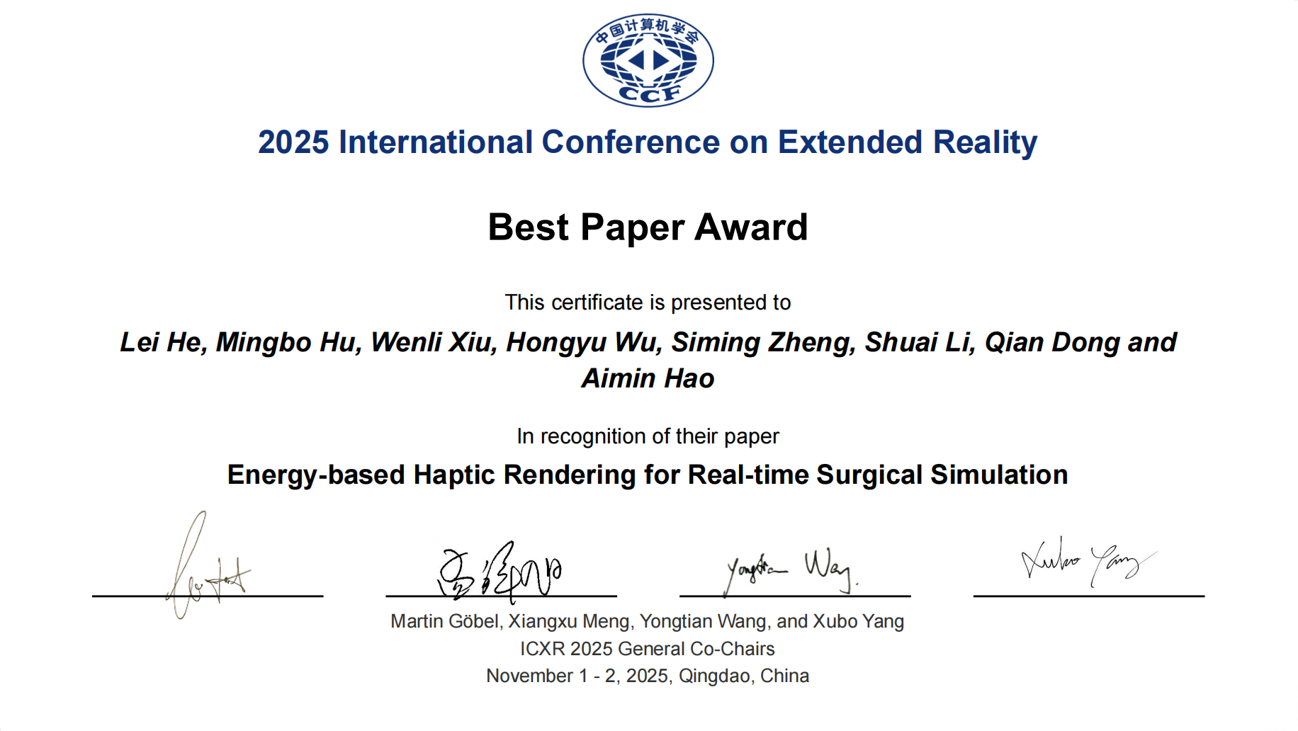 我院虚拟现实创新中心博士生贺磊和双聘教师吴洪宇老师发表的论文《Energy-based Haptic Rendering for Real-time Surgical Simulation》(基于能量的实时手术模拟触觉渲染)荣获会议“最佳论文奖”(Best Paper Award),并被推荐至计算机图形学领域期刊Computers & Graphics。该论文是在山东省重点研发计划项目支持下,由我院与青岛大学附属医院合作完成的学术成果。